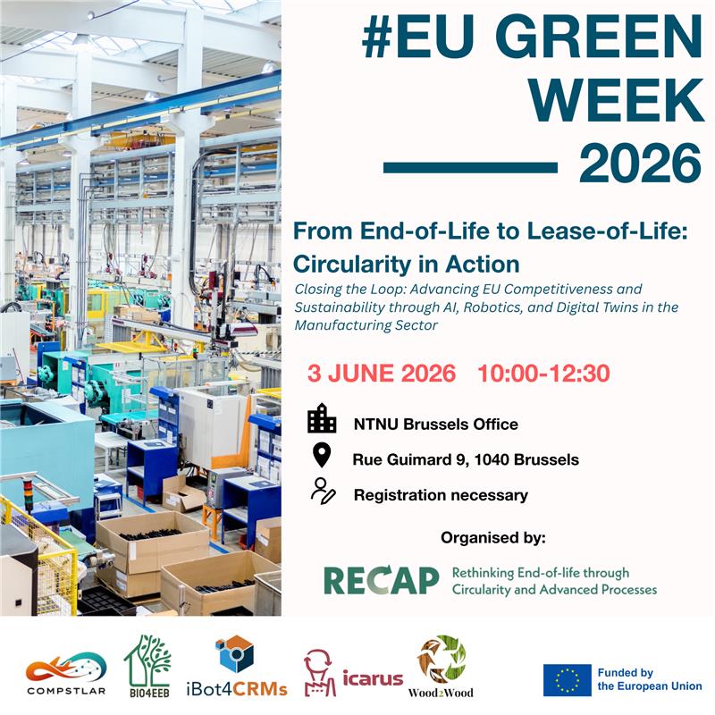 - Hosted by the RECAP CLUSTER (Rethinking End-of-life through Circularity and Advanced Processes), this event brings together five pioneering EU-funded projects: CompSTLar, BIO4EEB, ICARUS, iBot4CRMs, and Wood2Wood.