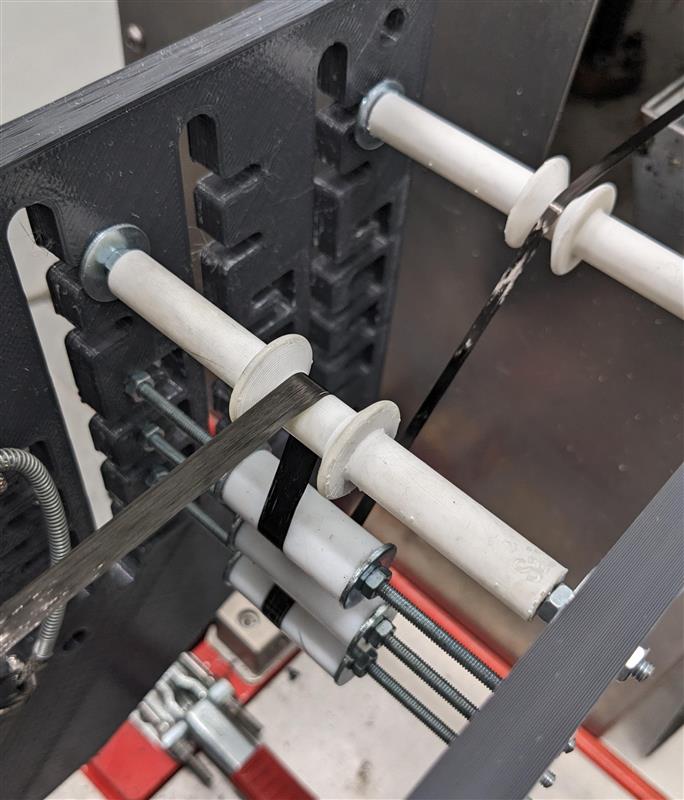 Figure 1: The combing effect’ in action: A compact carbon fibre tow is gradually spread open as it navigates the guide rollers, preparing it for optimal resin impregnation.